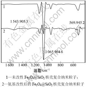 图2所示为氨基改性前后Fe3O4@SiO2复合纳米粒子的红外光谱。从图2可以看出:样品在569.945 2 cm-1处有一个较弱的吸收峰,这个峰对应着Fe3O4的特征吸收峰,在1 065.964 6 cm-1处有一个强吸收峰,这个峰归结于Si—O—Si的伸缩振动吸收峰,而在1 543.905 3 cm-1处出现的一个新的弱吸收峰可归属于氨基改性后接枝在氧化硅表面的—NH2功能基团的剪式振动峰[9],这说明氨基功能基团成功的嫁接到复合纳米粒子的氧化硅壳层表面上。