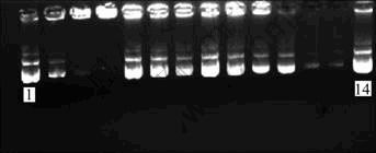 Fig.3 Agarose gel electrophoresis image of amino-modified Fe3O4@SiO2 nanocomposite particles adsorb plasmid DNA