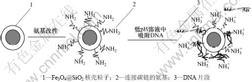 Fig.5 Schematic illustration of mechanism for amino-modified Fe3O4@SiO2 nanocomposite particles adsorb plasmid DNA