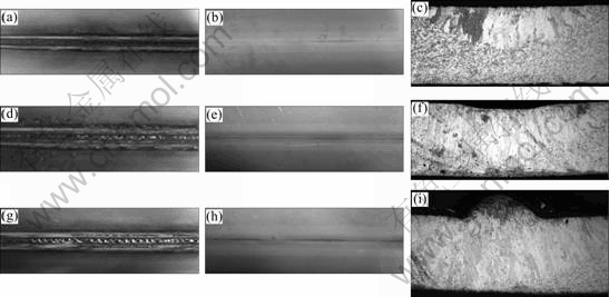 Fig.3 Bead shapes for plasma arc welding of galvanized steel sheets: (a) 60 A, top surface; (b) 60 A, bottom surface; (c) 60 A, cross- section; (d) 70 A, top surface; (e) 70 A, bottom surface; (f) 70 A, cross-section; (g) 80 A, top surface; (h) 80 A, bottom surface; (i) 80 A, cross-section