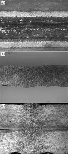 Fig.4 Bead shapes for laser-micro plasma hybrid welding of galvanized steel sheets (Arc current: 60 A; Laser-arc inter- spacing distance: 4 mm): (a) Top surface; (b) Longitudinal cross-section; (c) Transverse cross-section