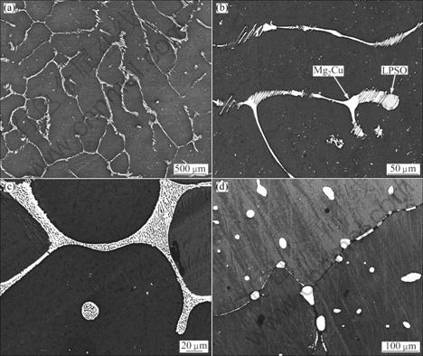 Fig. 1 SEM image of secondary electron image of as-cast Mg-3Cu-1Mn-2Zn-1Y alloy (a), backscattered electron (BSE) image of as-cast Mg-3Cu-1Mn-2Zn-1Y alloy (b), BSE image of as-cast base Mg-3Cu-1Mn alloy (c) and BSE image of annealed Mg-3Cu-1Mn-2Zn-1Y alloy at 450 ℃ for 48 h (d)