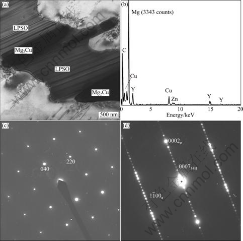 Fig. 2 TEM image of intermetallics along grain boundary showing LPSO structures arranged with Mg2Cu (a), typical EDS spectrum recorded from lamellar areas (b), SAED pattern corresponding to [001] zone axis of Mg2Cu (c), SAED pattern recorded from fine lamellar area in Fig. 2(a) (d)