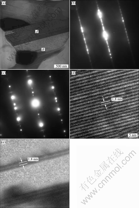 Fig. 3 TEM images of 14H LPSO structure: (a) Bright-field image of 14H structure arranged with α-Mg in eutectic structure; (b) SAED patterns recorded from regions marked by A in Fig. 3(a); (c) SAED patterns recorded from regions marked by B in Fig. 3(a) (d) magnification of region A in Fig. 3(a); (e) Magnification of region B in Fig. 3(a)