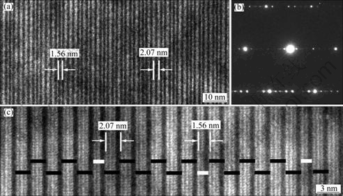Fig. 5 HRTEM image showing locally ordered structure in 24R LPSO structure (a), SAED pattern of area in Fig. 5(a) (b), HRTEM lattice fringes image of portion of areas showing two characteristic periods arranged in locally ordered manner (Black and white bold lines correspond to 8H and 6H building blocks, respectively) (c)