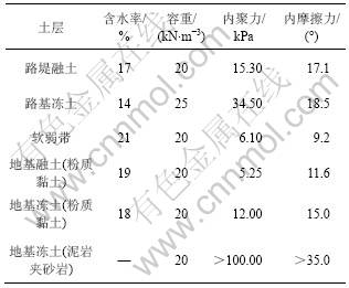 考虑到设备等原因,模拟冻土斜坡路基的冻融过程有一定困难,因此,着重从力学相似性角度对冻土斜坡路基失稳原因及其变形特性进行分析。研究表明,冻土斜坡路基达到最大融化深度的季节是在暖季,且降雨也主要集中在暖季,此时,冻土斜坡路基的稳定性最差,模拟此状态下的失稳及变形特性具有针对性。路基的最大融化深度及各土层力学参数通过现场试验数据选取,并考虑路基经过7~10次冻融循环下冻融土强度降低的特性[14]。