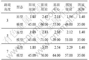 的2个主要影响因素。为单独分析其影响规律,试验设计了3种路堤中心高度和3种地基坡度的模型。其中3种路堤中心高度分别为3,5和7 m,地基坡度固定为1:6,根据式(1)及坡面朝向影响特性,3种路堤中心高度对应的人为上限如表2所示。分析地基坡度的影响规律时,保持路堤中心高度为5 m,各模型按路堤中心高度为5 m对应的人为上限选取,地基坡度分别为1:8,1:6到1:4。