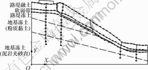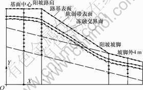 为研究冻土斜坡路基发生失稳的原因及失稳后在不同部位和不同深度的变形差异,沿阳坡顺向分别选取路基表面、软弱带表面、软弱带底面(冻融交界面)、基面中心剖面、阳坡路肩剖面、阳坡坡脚剖面和阳坡坡脚外4 m剖面共7处关键测试带进行分析,如图2所示。