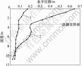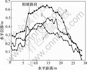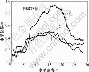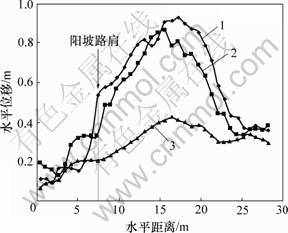 图6 路基基面中心和阳坡坡肩剖面的水平位移曲线