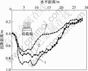 从图4还可以看出:路基表面和软弱带表面的水平位移分布曲线比较陡,而软弱带底面的水平位移分布曲线比较平缓。沿深度方向,软弱带的变形速率最快,路基变形的骤变点在软弱带底面即冻融交界面附近,软弱带对冻土斜坡路基的稳定性起控制作用。冻土斜坡路基的沉降曲线如图5所示,可见:冻土斜坡路基在列车荷载扰动下,易在路基面产生较大沉降。图6和7所示为各剖面的水平位移曲线。从图6和7可知:路基失稳后,整体向阳坡外侧运动,但各部分的变形速率及变形幅度差异较大,沿深度方向,路基的水平变形主要集中在路基表面到冻融交界面的浅层土体范围内,且软弱带的水平变形速率最快,骤变点在冻融交界面附近;顺坡方向,滑坡体后缘即阳坡附近的土体水平位移最大,顺坡向外,水平位移逐渐 减少。