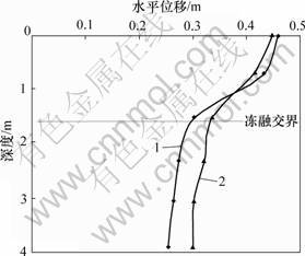 (2) 冻土斜坡路基在不同部位及不同深度土体的变形具有明显的差异,路基的水平变形主要集中在冻融交界面之上的浅层土体,骤变点发生在冻融交界面附近。滑坡体后缘的土体变形速率比前缘的土体变 形快。