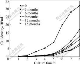 Fig.1 shows the growth curve of preserved culture after reviving at the 3rd, 6th, 9th, 12th and 15th months. When the culture was preserved for 3 months, the maximum cell density decreased to 1.7×108 mL-1 after reviving for 8 d, and the cell viability rate is only 54%. The longer the storing time, the lower the maximum cell density. When the culture was preserved for 15 months, the cell viability rate decreased to 22%. This indicates that the growth of culture after preservation is inhibited in a large scale. On the other hand, it can also be seen from Fig.1 that the growth of preserved culture has a longer lag phase than the growth of the unpreserved culture. And at the 8th day, the growth of preserved cultures mostly stays in a logarithmic phase, but not in the stable growth phase. These show that the cell density of preserved culture should have an increase after 8 d. As a result, another experiment for prolonging the culture time was carried out. The result shows that when the culture time was prolonged to 14 d, the cell density of preserved culture for 3, 6, 9, 12 and 15 months would increase to the maximum cell density of 3×108, 2.9×108, 2.8×108, 2.5×108 and 2.4×108 mL-1, respectively, which is almost the same as the unpreserved culture. These indicate that freeze drying and frozen preservation could cause many cells death, but it is not obvious to decrease the growth ability of the living cells.