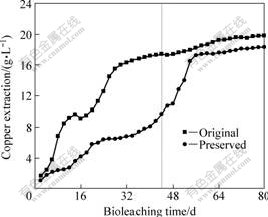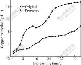 Fig.2 Copper extractions in chalcopyrite bioleaching experiment in 44 days with original and preserved cultures after 15 months