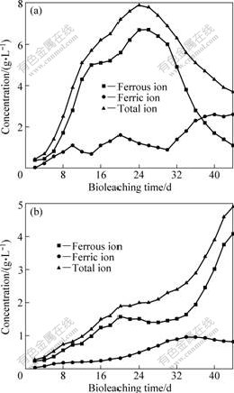 final stage. When almost 66% of copper is leached (from the 28th day and on), the concentration of ferrous ion begins to decrease and that of ferric ion begins to increase, which corresponds to an increase of redox potential in the solution over 460 mV. While in the Fig.4(b), the total ion concentration increases gradually and finally reached 4.9 g/L. Ferrous ion concentration increases before 20 days and then decreases slightly till the 30th day. During this period, ferrous ion is continually oxidized to ferric ion but no enough ore sample is dissolved to generate ferrous ion. After that, ferrous ion concentration increases sharply to 4 g/L, mainly due to increase of chalcopyrite dissolution. Ferric ion concentration always retains at a low value and it is only 0.9 g/L at the end.