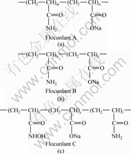 Fig.1 Structural formula of flocculants: Flocculant A, average relative molecular mass of 23 millions, degree of hydrolysis of 15%; Flocculant B, relative molecular mass of 22 millions, degree of hydrolysis of 30%; Flocculant C, average relative molecular mass of 20 millions