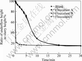 在絮凝沉降30 min内读取硅酸二钙浆液泥层高度的变化,以考察各絮凝剂对浆液沉降性能的影响。初始10 min浆液平均沉降速率列于表1中,絮凝剂对浆液底流高度比(底流高度与浆液总高度之比)的影响如图3所示。