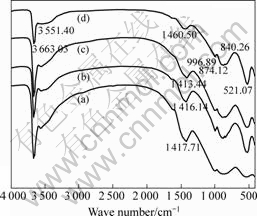 Fig.4 Infrared spectra of flocculants on dicalcium silicate: (a) Flocculant A; (b) Flocculant B; (c) Flocculant C; (d) Blank