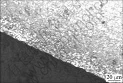 固件在950 ℃真空淬火后头部试样支撑面横断面的金相照片。从图1可见富氧α层的组织特征。其中,靠近支撑面表面的组织细小、α相含量较多,远离表面的组织α相含量相对减少,而β转变组织含量增加。由图1中显微组织的变化可近似估计出富氧α层的深度小于20 μm。