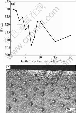 Fig.2 Vickers hardness as function of depth of contamination layer (a) and metallograph (b) of contamination layer on TC4 titanium alloy fasteners
