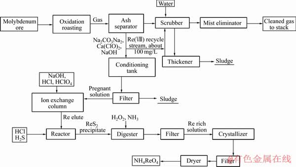 由于铼元素在矿石中含量很低,往往不能直接提取,而是作为制钼或炼铜工艺的副产品形式产出。因此,从在制钼或炼铜过程中氧化焙烧工序产生的含铼的铜、钼矿的烟道灰中提取铼是工业上使用的主要制铼方法。在火法冶金过程中,钼矿在焙烧加热阶段, 铼元素极强的亲氧性使得元素以高价态氧化物形式存在。由于铼氧化物较好的挥发性,可将焙烧炉温度加热到900~950 K,确保铼挥发完全,用水吸收之,得到含有铼酸盐(HReO4)的母液,在使用离子交换及溶剂萃取等富集分离方法,进一步将铼元素分离纯化,制得的产物为高铼酸铵或铼单质。主要反应方程式如下: