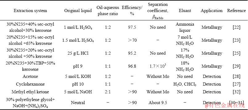 采用溶剂萃取方法分离铼元素是工业生产中应用最为广泛的方法。溶剂萃取使用设备简单、操作方便,既适用于铼元素实验室检测分析,又适用于工业铼生产、环境工程、医药化工等领域。江西铜业集团是我国最大的铼生产商,该公司以20%N235为萃取剂、65%煤油为溶剂、15%仲辛醇为增溶剂,制成萃取液体,在酸性条件下进行萃取后再用氨水反萃,重结晶净化后制得高铼酸铵[17]。萃取过程通常在室温条件下即可完成。表1所列为不同萃取体系的萃取效果。