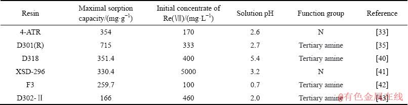 )形式存在,吸附时,活性基团与高铼酸根的亲和性大于与树脂中阴离子的亲和性,解吸时,洗脱液中阴离子的亲和性大于高铼酸根与活性基团的亲和性,进而完成分离纯化过程。表2所列为几种典型树脂对铼的最大吸附容量。