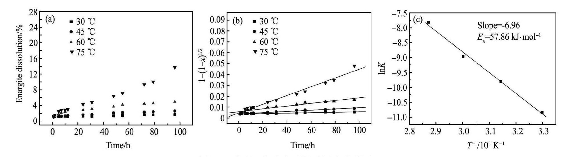 ( a) Kinetic curves of dissolution rate; ( b) Curves of 1 - ( 1 - R)1 /3~ t ; ( c) Arrhenius plot for enargite leaching