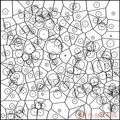 由每个权值点所关联的单胞集合构成权值点集的Laguerre图。从Laguerre单胞的数学定义可以看出:单胞的形成受点集空间位置与权值分布的共同影响。特别地,若权值点集中所有点的权值大小均相等,则Laguerre单胞退化为Voronoi单胞。图1所示为权值大小随机分布的二维Laguerre图。