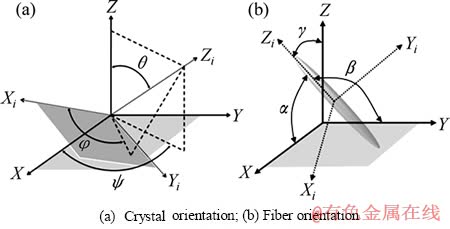 )来描述,如图2(a)所示。对于第i个任意取向的晶粒,局部坐标(xi,yi,zi)与参考坐标系(x,y,z)的关系如下: