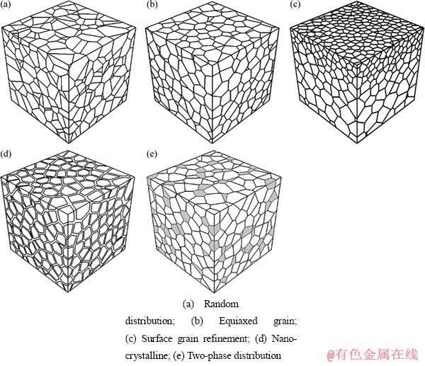 对于多晶体材料微结构中组成物含有多相的情况,如纳米复合材料微结构[17],每一相组成物的晶粒平均粒径、分布特征、晶体学取向等不相同,其差异程度将影响材料的性能指标,因此需要准确地模拟每一相组成物的特征。类似于模拟表层细化的多晶体材料微结构,构造多类含有指定分布的形核集合,以此进行球填充过程下的Laguerre晶胞构造;同时,对单胞进行跟踪识别,获得每一类形核对应产生的晶粒,作为多相多晶体材料微结构组成物的一相。图3(e)展示了一个多相多晶体材料微观组织结构的几何模型。