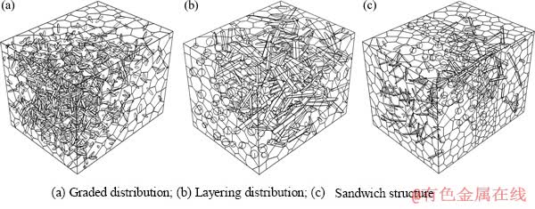 在一个真实的复合材料微观组织结构内,增强物的尺寸和形状一般都是不规则的,且增强物的取向也不同。为了体现这种不规则现象对复合材料性能的影响,就要构筑一个由不同尺寸、不同相、不同取向分布增强物的复合材料微观组织结构模块。图4(b)展示了晶须增强的复合材料微观组织结构模块。图4(c)展示由3种不同相增强物增强的复杂型复合材料微观组织结构模块。图4(d)展示了短纤维增强物选择性分布的复合材料微观组织结构模块。