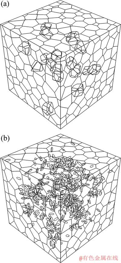 Laguerre算法获得对应的胞体几何结构,并将胞体结构中随机形状的P面体代表晶粒,这个P面体中没有优先的晶粒生长方向。图3(a)和(b)分别展示了形核种子点集按随机分布与球填充分布所构造的多晶体材料微观组织结构。