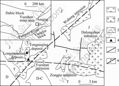 Fig. 1 Geological map of Yueshan area of Anhui Province (modified from Ref. [8]): 1-Diorite; 2-K-diorite; 3-Geological boundary; 4-deposits; 5-Fault; 6-Basement rift; D-Devonian; D-C-Devonian-Carboniferous; T-Triassic; J-Juassic