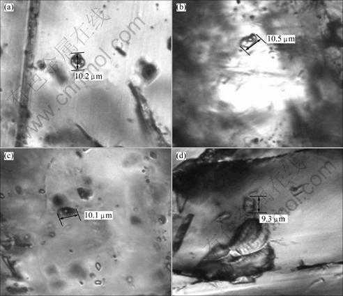 Fig. 2 Microphotographs of fluid inclusions from Longmenshan copper-polymetallic deposit: (a) In calcite; (b) In diopside; (c) In quartz; (d) In garnet
