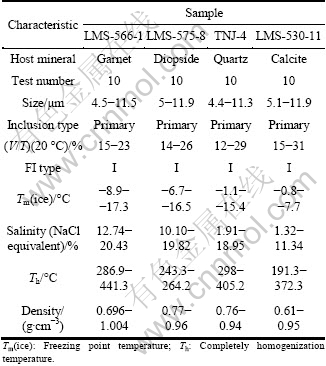 On the basis of detailed geological field survey, the garnet, diopside, quartz and calcite samples of the mineralization stage were collected for studying. First, the 0.2-0.3 mm double sides were prepared in order to observe the lithofacies and fluid inclusions by using microscope, and then, the representative samples were selected and could be used to measure the temperature of the fluid inclusions. The compositions of the fluid inclusions trapped in garnet, diopside, quartz, calcite and chalcopyrite were analyzed by using the group analysis of fluid inclusion.