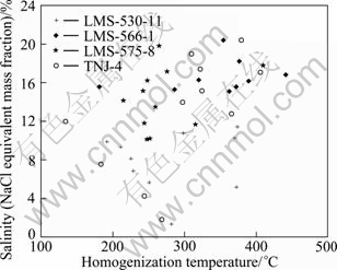 Fig. 5 Salinity vs homogenization temperature plot of fluid inclusions from Longmenshan copper-polymetallic deposit