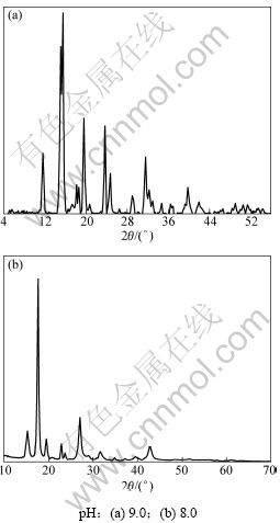 图1所示是pH为8.0和9.0时前驱体粉末的XRD图谱。从图1可见:由配位沉淀得到的沉淀产物结晶完整,其XRD图谱与标准图谱(β-CoC2O4·2H2O图谱[15])大不一样,目前尚无标准的衍射卡可以参照分析。根据反应体系Co(Ⅱ)-C2O42--NH3-NH4+-H2O热力学分析可知[16]:当7.0<pH<12.0时,不仅有沉淀反应,而且有氨与金属Co2+的配位反应。整个反应过程为配位沉淀过程,因此,可以初步推断该沉淀产物为钴与氨配合后参与沉淀反应所形成的一种含氨草酸钴复盐粉末。