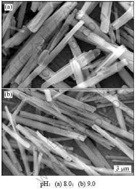 图3所示为含氨草酸钴复盐粉末的SEM照片。从图3可知:含氨草酸钴复盐粉末形貌为纤维状,分散性好。根据金属草酸盐分子的结构可知[17],C2O42-含有双配位键,2个C2O42-基团可以与中心金属原子(M)形成1个二维平面结构的片状分子,在垂直于该片状分子平面的方向,配合连接着2个L配体,这些L配体可以进一步构成长链,这些长链又按照一定规则形成长方形或针状草酸盐类化合物晶体。本研究中,在Co2+-NH4+-NH3-C2O42--H2O体系进行配位沉淀反应时,溶液中的pH用氨水调节,反应体系中存在反应NH4++OH-?NH3·H2O。当pH≥8.0时,NH4+部分以NH3·H2O的形式存在并与Co2+形成配合离子后直接参与共沉淀反应过程。而与金属草酸盐分子平面垂直连接的L配体也变为具有极性的基团—NH2,这样,通过含NH3基配合物以链状结构连接[(NH3)M-OX- M(NH3)]2+的生长基元不断地沿轴向取向连生(其中,OX为草酸根离子),前驱体晶体呈现出明显的各向异性,其生长也呈现明显的择优取向,即具有高比表面能的晶核表面能吸附成核基元的概率要大于那些低表面能的晶核表面吸附成核基元的概率,从而导致高表面能晶核表面的优先生长,而在短径方向生长缓慢,最后,前驱体晶体呈现明显的纤维状形貌。所以,氨在草酸钴复盐粉末的结构与含量是前驱体粉末呈现纤维状形貌的主要原因。