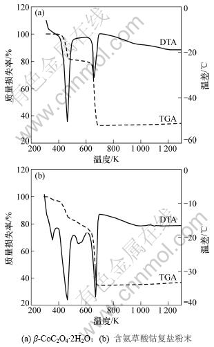 图4所示为β-CoC2O4·2H2O和含氨草酸钴复盐粉末的DTA/TGA曲线。