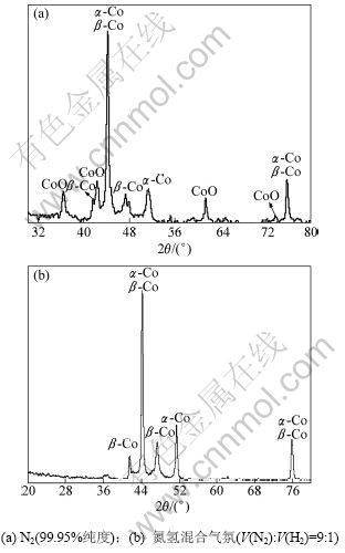 图5所示为不同热分解气氛条件下含氨草酸钴复盐粉末热分解产物的XRD图。由图5可以看出:在只通入氮气(含氧量小于0.05%)的情况下,热分解产物的物相包含有CoO,α-Co和β-Co物相(图5(a));而在通入混合气体(V(N2):V(H2)=9:1)时,热分解产物中只有α-Co和β-Co(图5(b))。这是因为超细金属钴粉很容易被氧化,在氮气气氛中由于微量氧的存在,金属钴粉被氧化成CoO。因此,在含氨草酸钴复盐粉末热分解过程中,热分解气氛必须控制为弱还原性气氛。