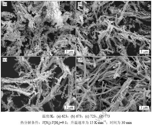 图6所示为含氨草酸钴复盐粉末在不同温度下热分解产物的SEM照片。由图6可知:含氨草酸钴复盐粉末经过热分解之后均发生了一定程度的收缩,且热分解产物粒子表面没有复盐粉末粒子表面光滑。热分解产物保持了含氨草酸钴复盐粉末纤维状形貌。这是由于在热分解过程中,含氨草酸钴复盐在弱还原性气氛中分解成金属原则上是1个复盐颗粒分解得到1颗金属颗粒,形成钴粒子的基本尺寸由复盐粉末粒子粒径决定。当热分解温度为623~723 K时,得到的热分解产物粒子粒径较小,孔隙较多,单个小颗粒之间聚集在一起(见图6(a)~图6(c));随着热分解温度升高,热分解产物由链状变为多孔纤维状,孔隙也逐渐较少;当温度为773 K时,热分解产物粒子间孔隙基本消失,开始出现烧结现象,纤维状更加明显。因此,纤维状多孔金属钴粉热分解温度为623~723 K。