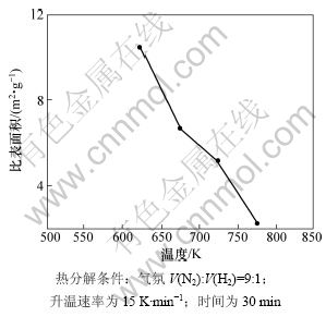 Fig.7 Effect of decomposition temperature on specific surface area of cobalt powders