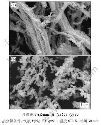 图8所示为含氨草酸钴复盐粉末在不同升温速率下热分解产物的SEM照片。从图8(a)可见:当升温速率较小时,热分解产物体积变化不大,金属钴粉疏松多孔,形貌继承性好,为纤维状,比表面积为10.44 m2·g-1。从图8(b)可见:当升温速率较大时,所得到的金属钴粉体积收缩很大,粉末粒子较硬,比表面积为4.34 m2·g-1。这是由于在热分解过程中,有大量气体放出,当温度升高时,含氨草酸钴复盐在低温下是先脱NH3,接着脱水,然后脱配合氨,最后进行热分解。分解时产生气体平缓,这样,粉末在脱气时呈多孔隙的膨松状态,产物体积变化不大,粒子形貌继承性好;当升温速率很大时,脱NH3、脱水、脱配合氨和热分解同时进行,产生大量气体,导致草酸钴粉粒子爆裂,体积收缩大,团聚严重,比表面积小。