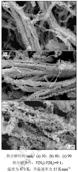 图9所示为含氨草酸钴复盐粉末在不同热分解时间下热分解产物的SEM图。从图9可知:当热分解时间为30 min和60 min时,金属钴粉蓬松多孔,纤维状形貌明显;延长热分解时间,金属钴粉出现烧结,粉末变致密,孔隙率减小,同时晶粒长大,粉末硬团聚严重。故适宜的热分解时间为30~60 min。