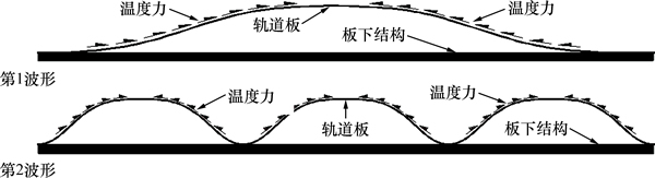 Ⅱ型轨道板在温度压力作用下的竖向变形方向受板下结构层的限制,只能产生如图1所示的变形波型。图1中的第2波形曲线为多波形,由于各半波相同,因此,可以按照第1波形曲线将多波形的1个半波作为研究对象。由于变形曲线的曲率是由两端向中间逐渐增加,故可近似假设轨道板在温度压力作用下的变形曲线yf为正弦形[12]。当变形波长为l、变形矢度为f时,变形曲线yf可写为