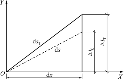 轨道板的轴向压缩△l可通过计算变形波长l变形后的弧弦差△lT与变形前的弧弦差△l0的差值获得。若设变形波长l中任一微小弦长dx对应的变形前后的弧长分别为ds与dsT,则△l0,△lT,ds及dsT的相互关系如图5所示。由图5可知,△lT,△l0及△l分别可写为:
