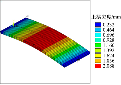 将△t=91.8 ℃作为温度荷载施加在通过ANSYS软件建立的同一弦长、同一初始弹、塑变形的计算模型中,计算的压杆上拱矢度如图6所示,上拱矢度为2.088 mm,与计算临界力P时采用的容许变形矢度2.000 mm相比,误差很小。
