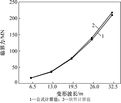 2) 采用推导的临界力计算公式计算临界力最小时的最不利波长为6.53 m,约为1块轨道板的长度。