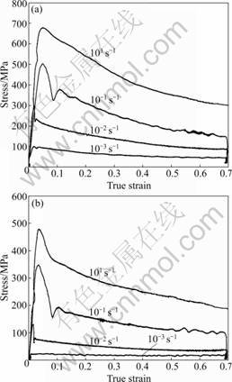 Fig.1 True stress—strain curves of TiAl alloy at different temperatures: (a) 1 100 ℃; (b) 1 200 ℃