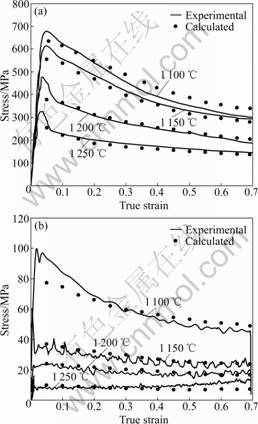 Fig.4 Comparison of calculated results and experimental results of flow stress for TiAl-based alloy at 1 s-1 (a) and 10-3 s-1 (b) and different temperatures